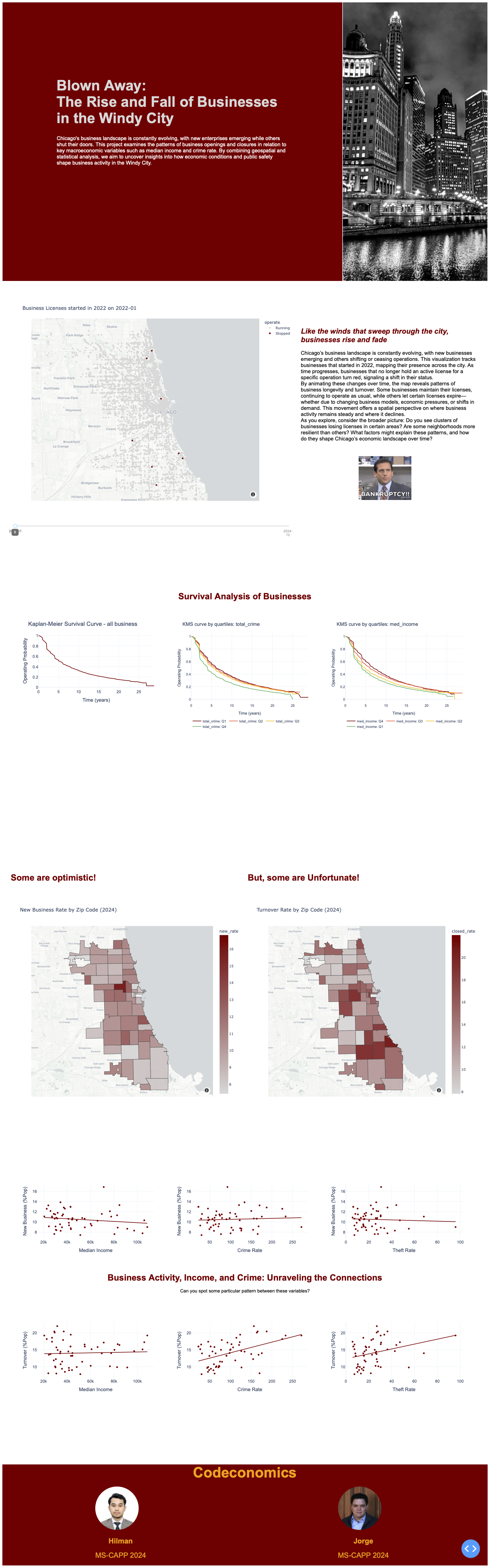 This project examines the patterns of business openings and closures in relation to key macroeconomic variables such as median income and crime rate. By combining geospatial and statistical analysis, we aim to uncover insights into how economic conditions and public safety shape business activity in Chicago. The work informs policy making on businesses trends in the city of Chicago. The project uses data from businesses licenses and crime events from the Chicago Data Portal (https://data.cityofchicago.org) and median income data from the US Census Bureau (https://www.census.gov).